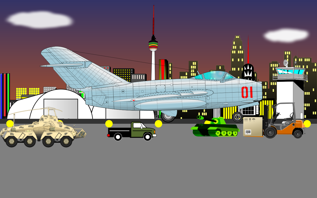 This features a large airplane parked on the tarmac, surrounded by various trucks and military vehicles. There are two tanks nearby, one closer to the left side of the scene and another further back towards the right. A few cars can also be seen in the vicinity, with one located near the center-left of the image and another on the far right. The airplane is positioned between these vehicles, creating a busy atmosphere around it.