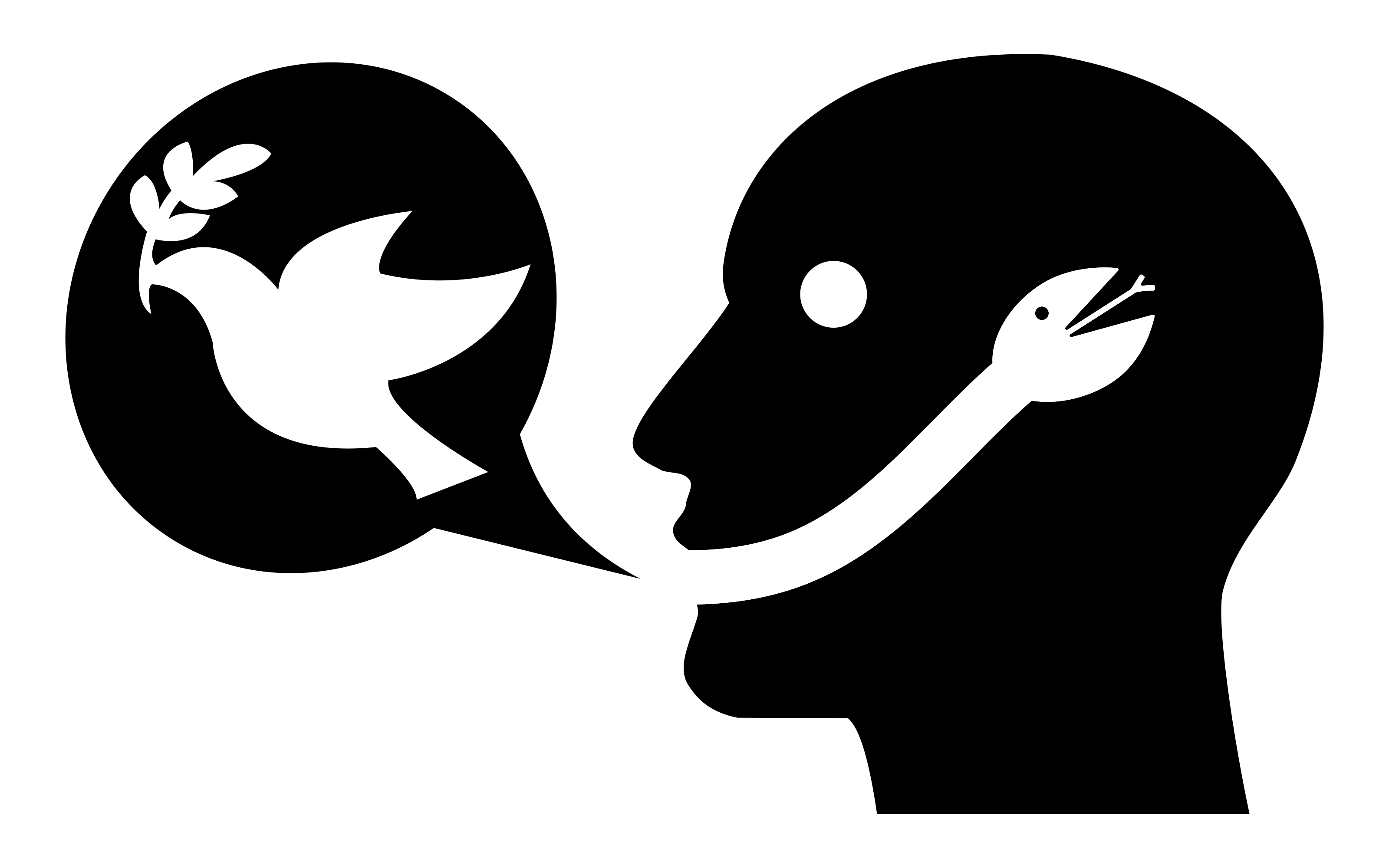 This features a black silhouette of a person's head with an open mouth, giving the appearance that they are speaking. Above this head, there is a white dove flying and holding an olive branch in its beak. This dove is positioned to the left of the head, creating a sense of movement and action within the scene. The black silhouette of the person's head serves as a striking contrast against the white dove, drawing attention to both elements within the image.