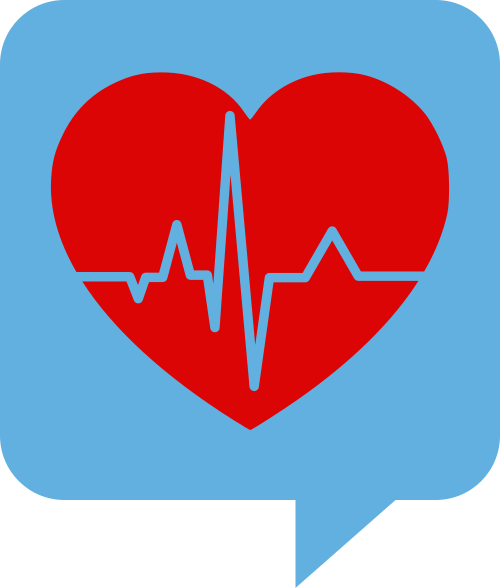 This features a red heart with a blue speech bubble logo. Inside the heart, there is an illustration of a heartbeat line, which adds to the overall theme of the image. This design could be used for various purposes such as promoting health and wellness or conveying a message related to love and affection. The combination of red and blue colors creates a visually appealing contrast that draws attention to the heart symbol.