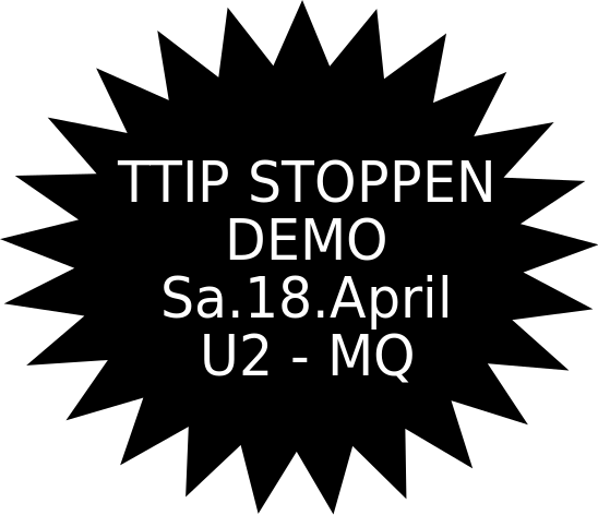 This features a poster with a black and white design, promoting an anti-TTIP demonstration. The poster is written in German and has a spiky circle as its central element. The text on the poster reads "Tipp Stopfen Demo" which translates to "Stop TTIP Demonstration." The date of the event is listed as April 18th, with the time being noted at 2 PM.
