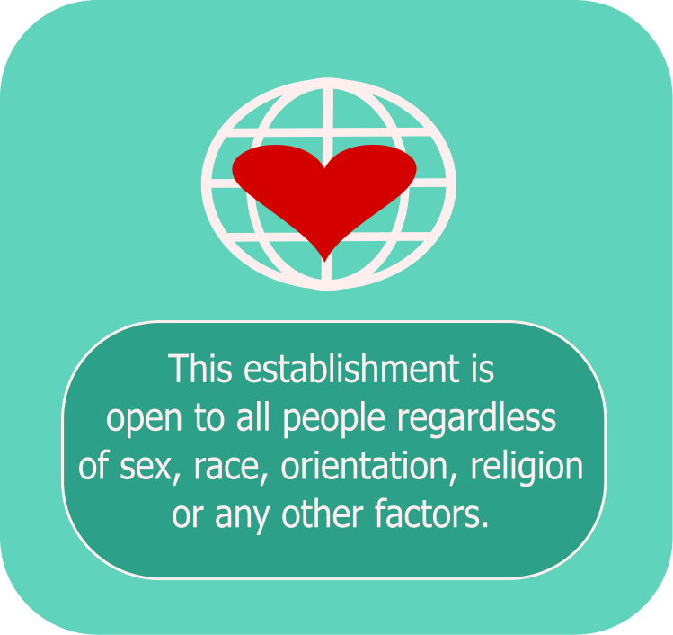 This features a green square with an anti-discrimination sign in the center. The sign reads, "This establishment is open to all people regardless of sex, race, orientation, religion, or any other factors." Above the sign, there is a white globe with a red heart in the middle of it. This image conveys an inclusive message and promotes equality for everyone.
