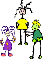 This features a group of three cartoon children standing next to each other. One child is on the left, another in the middle, and the third one on the right side. Each character has distinct facial expressions: the child on the right appears mean, the middle child looks shocked, and the child on the left seems sad. The characters are all wearing different colored clothing, with the green-skinned child standing out among them.