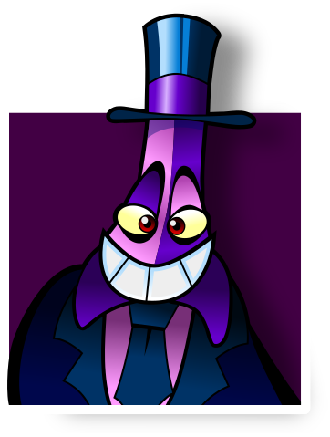 This features a cartoon character with a purple hat and a mischievous smile. This character appears to be wearing a suit, which adds an element of sophistication to its playful demeanor. The character's facial expression is quite expressive, making it seem as if it is about to speak or engage in some sort of interaction with the viewer. The overall appearance of this character suggests that it could be a part of a comic book or animated series, where it might play a role as a villain or an eccentric sidekick.