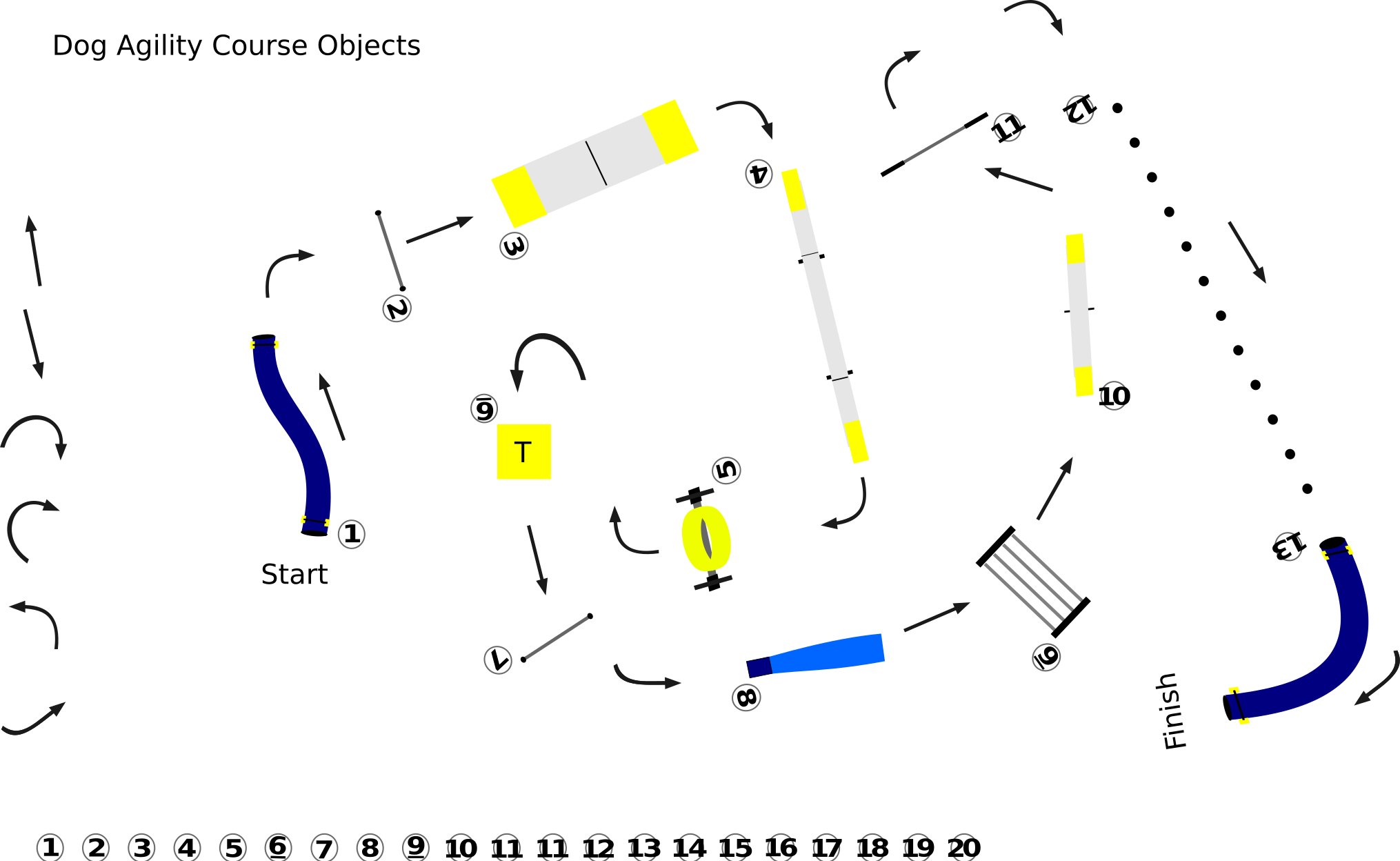This is a diagram of an obstacle course for dogs. It features several different colored objects, including blue and yellow, that are scattered throughout the course. There are also numbers on the diagram, likely indicating the order in which the objects should be navigated by the dog. The course appears to be designed to challenge the dog's agility and coordination skills as it progresses through the various obstacles.