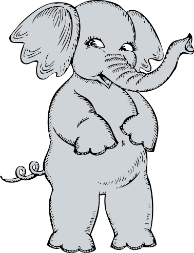 This features a cartoon drawing of an elephant with a long trunk, standing on two legs. It appears to be a female elephant as it is depicted in a feminine manner. The elephant has large ears and a curled tail, adding to its unique appearance. Its trunk is raised upwards, giving the impression that it's pointing at something or someone off-screen. This whimsical drawing of an elephant could be used for various purposes such as children's books, educational materials, or even as a decorative piece in a nursery or playroom.