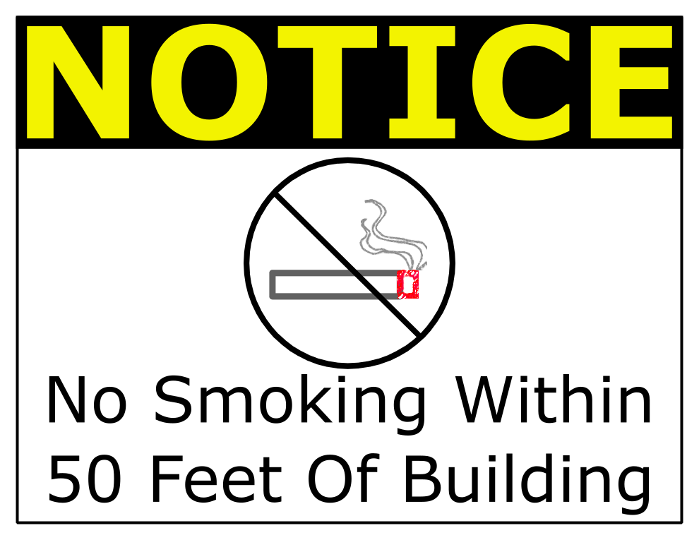 This features a sign that reads "no smoking within 50 feet of building." This warning is displayed in bold yellow letters on a white background. The sign is meant to inform people about the rules and regulations regarding smoking near the building, ensuring a clean and healthy environment for everyone.