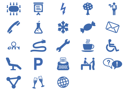 This features a collection of various blue icons arranged in five rows. These icons represent different subjects, such as a chair, a keyboard, and a cup. There are also several other icons that depict objects like a cell phone, a book, a globe, and an envelope. Additionally, there is a person icon present among the collection. The arrangement of these icons creates a visually appealing display, showcasing their diverse subjects and functions.