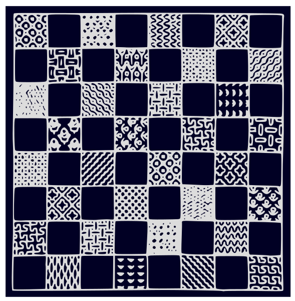 This is a black and white checkerboard with various patterns on the white spaces. These patterns include geometric shapes, such as diamonds and squares, as well as more intricate designs like circles and triangles. The checkerboard appears to be made up of individual tiles or blocks that are arranged in a grid-like pattern. Overall, it is an interesting and visually appealing design that showcases the creativity behind the patterns used on each tile.