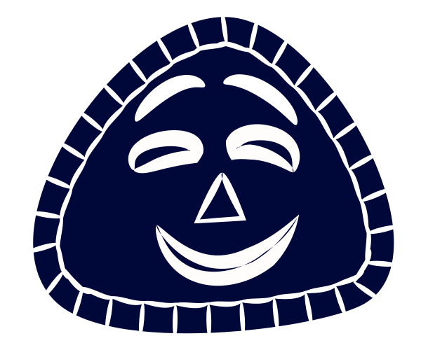 This features a black and white drawing of a smiling face with a big smile. The face is adorned with two eyes, one on the left side and another on the right side, as well as a nose in the center. The mouth is wide open, displaying a toothy grin. This artistic representation of a happy face appears to be stitched onto the background, creating an interesting visual effect.