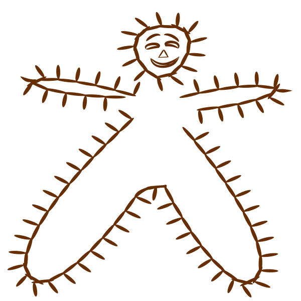 This features a drawing of a smiling sun with arms and legs, giving it the appearance of a happy person. The sun is positioned in the center of the picture, surrounded by various spikes or thorns that extend outwards from its body. These spikes are scattered throughout the drawing, creating an interesting visual effect. The overall composition of the image gives off a warm and cheerful vibe, with the sun's smiling face adding to this pleasant atmosphere.
