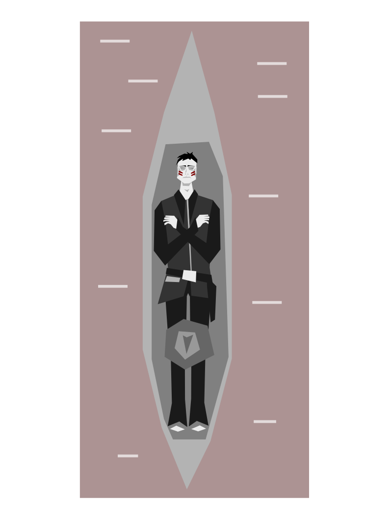 This features a man sitting in the middle of an oddly shaped boat, which appears to be made out of wood. He is wearing a black suit and has his hands crossed while sitting inside the boat. The boat's shape resembles a coffin or a long, narrow box, giving it a somewhat eerie appearance. The man seems to be the only occupant in this peculiar vessel, creating an intriguing scene that captures one's attention.