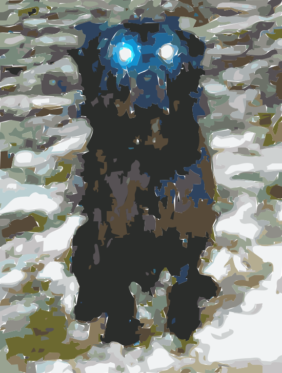 This features a black dog with blue eyes, standing in the snow. It appears to be looking at something off-camera, possibly capturing its attention. The dog is positioned towards the center of the scene and seems to be the main focus of the photo. The background consists of a rocky surface, adding an interesting texture to the image. Overall, it's a unique and intriguing photograph that showcases the dog in a winter setting.