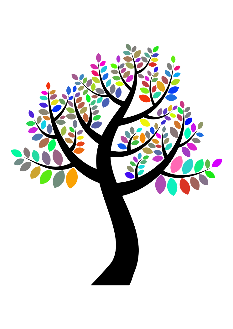 This features a tree with many different colored leaves. These leaves are scattered throughout the tree, creating a vibrant and lively appearance. The tree is depicted in black and white, which adds an artistic touch to the illustration. The various colors of the leaves make it stand out as a unique and eye-catching piece of artwork.