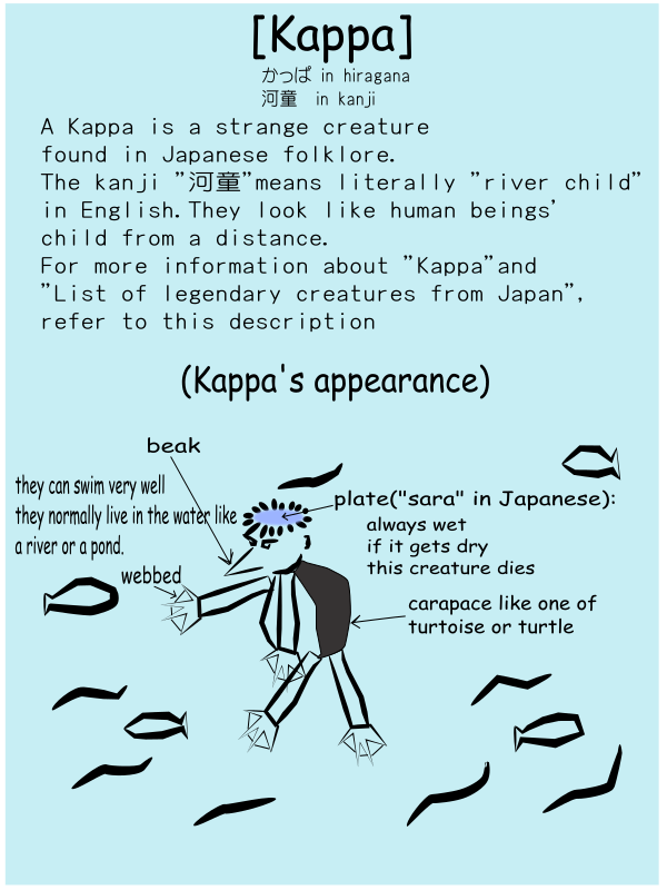 This is a comic book style drawing of a creature called Kappa. It appears to be a strange and unusual creature with a humanoid body, webbed hands, and feet. The creature has a blue face and is holding a fish in its hand. The drawing also includes text describing the appearance and characteristics of this creature from Japanese folklore.