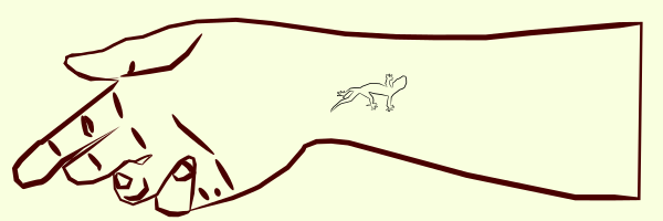 This features a hand with a tattoo of a gecko on the palm. The hand is positioned in such a way that it appears to be pointing towards the viewer, drawing attention to the unique design. The gecko's outline is black, contrasting against the beige-colored skin of the hand. The fingers are adorned with black lines, adding an additional layer of detail and interest to the tattoo. Overall, this image showcases a creative and eye-catching piece of body art.