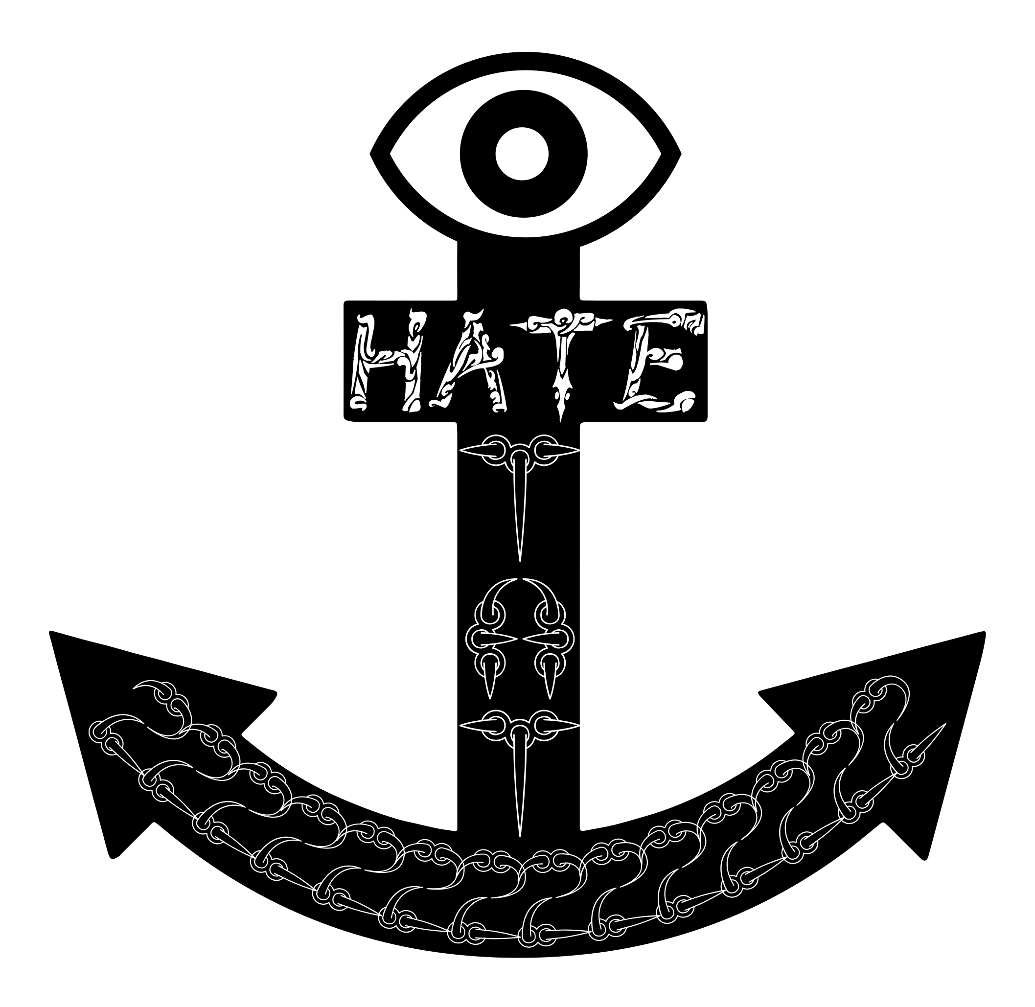 This features a black and white anchor with the word "Hate" written on it. The anchor is surrounded by various birds, creating an intricate design. The anchor itself has a few small holes in it, adding to its unique appearance. Overall, this artistic piece showcases a strong message against hate while still maintaining a visually appealing design.