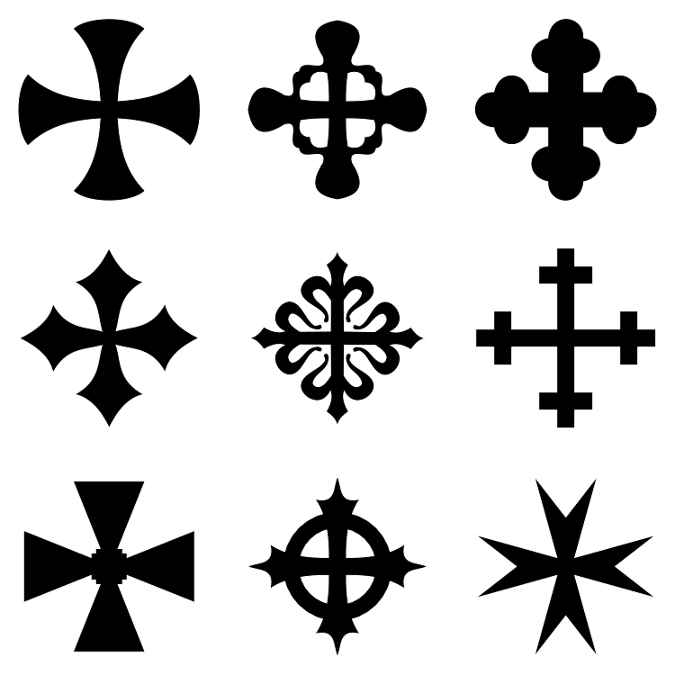 This features a collection of nine different styles of black crosses. These crosses are arranged in a neat row, showcasing their various designs and patterns. Each cross is distinct from the others, offering a diverse range of options for use in flags or coat of arms. The arrangement of these crosses creates an appealing visual display that highlights each unique design while maintaining a cohesive theme throughout the collection.