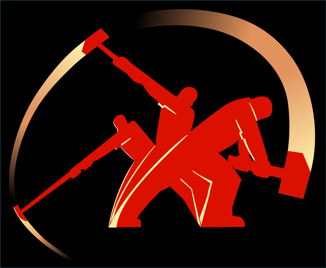 This features a red and black logo of three men working together. They are holding large red hammers, which they use to perform their tasks. Each man is positioned in different areas of the logo, with one on the left side, another in the middle, and the third on the right side. Their positions suggest that they might be working on a construction project or some other task that requires teamwork and coordination. The red color of the hammers adds a bold and striking element to the logo, making it visually appealing and memorable.