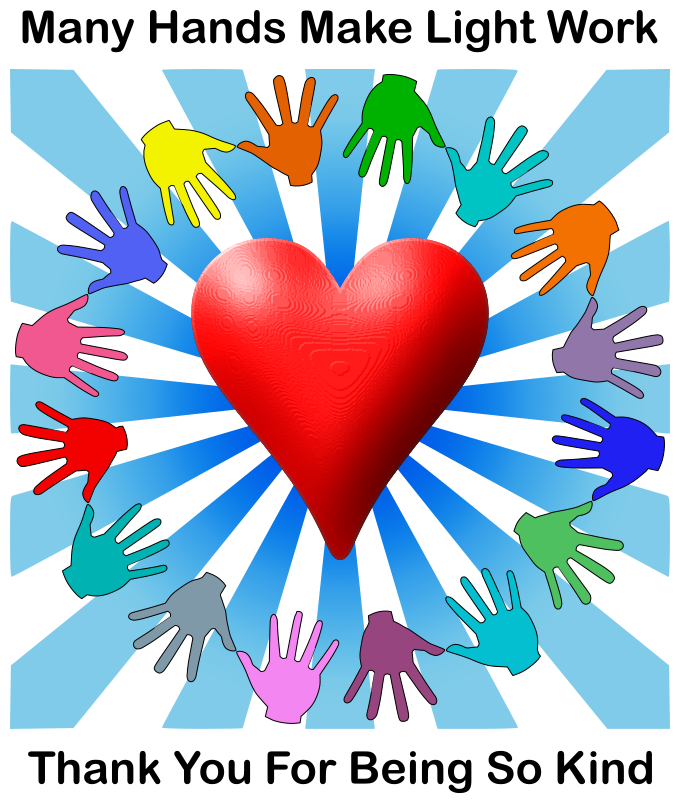 This features a red heart surrounded by various colored hands, all of which are positioned around the heart. The hands come in different shades and sizes, creating an interesting visual effect. Above and below the hands, there is text that reads "Many Hands Make Light Work Thank You For Being So Kind." This message conveys a sense of gratitude for those who contribute to making life easier or more enjoyable for others. The image could be used as a motivational poster or a decorative piece in a home or office, reminding people of the importance of teamwork and kindness.