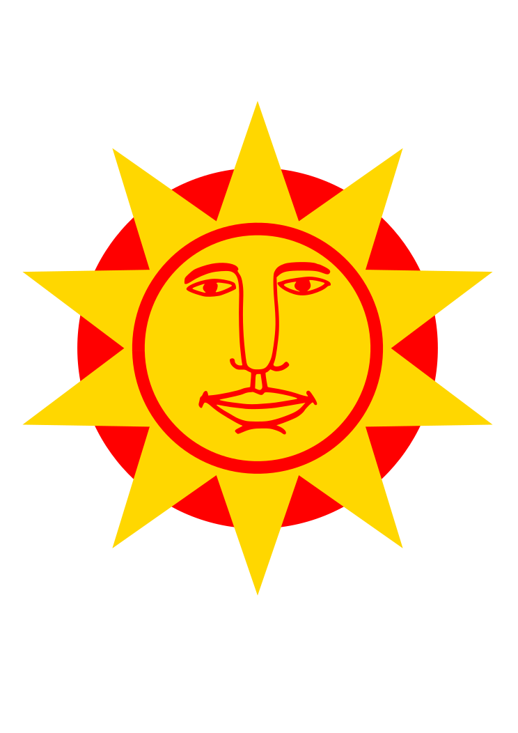 This features a yellow sun with a human face, giving it the appearance of a smiling face. The sun is prominently displayed in the center of the image and has a long nose that adds to its unique design. This creative representation of the sun gives it a friendly and approachable look, making it an interesting and eye-catching piece of artwork or decoration.