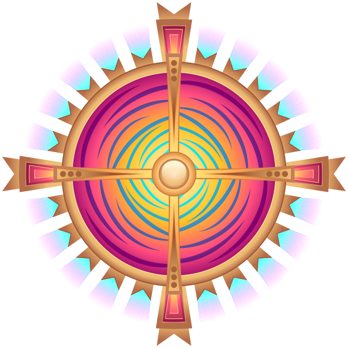 This features a colorful and intricate design element, resembling a cross or a sun. It is composed of various shapes and colors, including pink, yellow, blue, orange, and green. The central part of the design has a golden appearance, adding to its visual appeal. This artistic piece appears to be inspired by nature, as it incorporates elements from the natural world such as sunlight and flowers. Overall, the image exudes a sense of creativity and vibrancy, making it an eye-catching decorative element for any space.