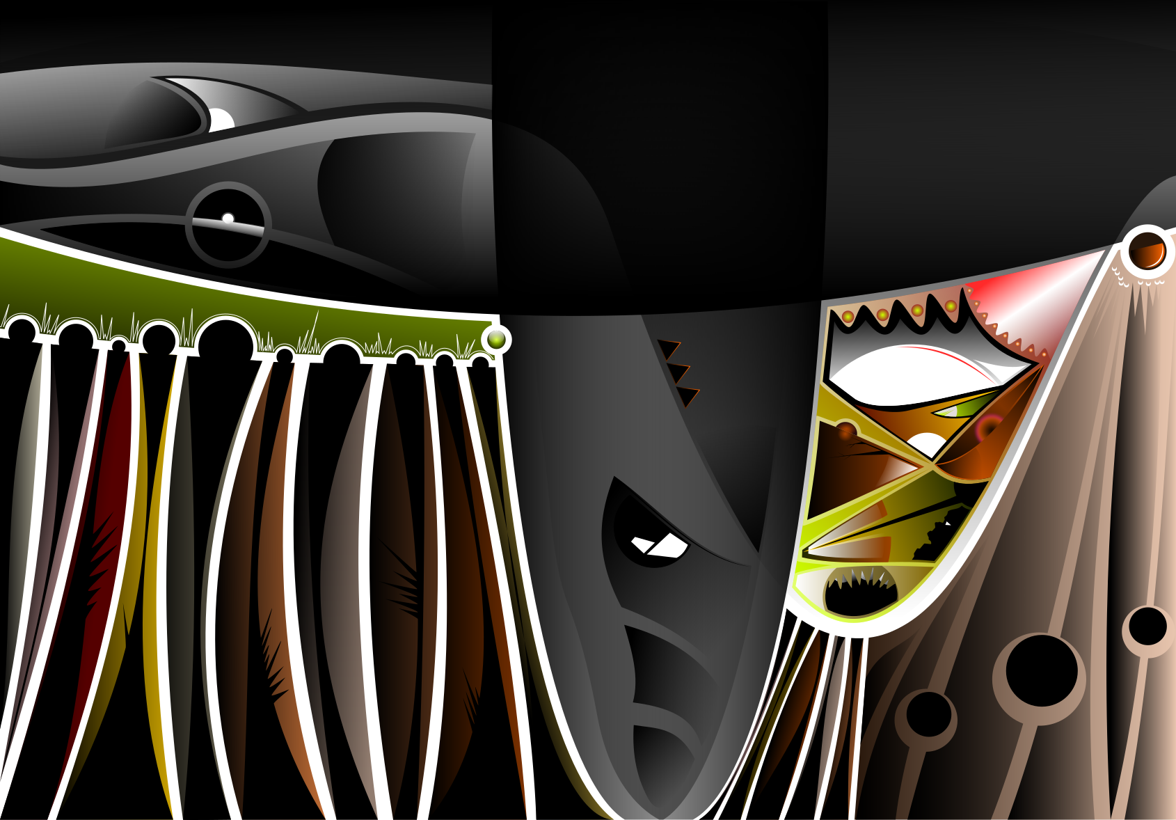 This is a black and white artistic representation of an eye, with the iris being the focal point. The eye is surrounded by various shapes and designs that create a visually intriguing composition. There are several circles scattered throughout the scene, some close to the eye and others further away. Additionally, there are two smaller eyes visible in the image, one located near the top left corner and another towards the bottom right side of the frame. The overall effect is an artistic representation of a complex visual concept that invites viewers to explore its intricacies.