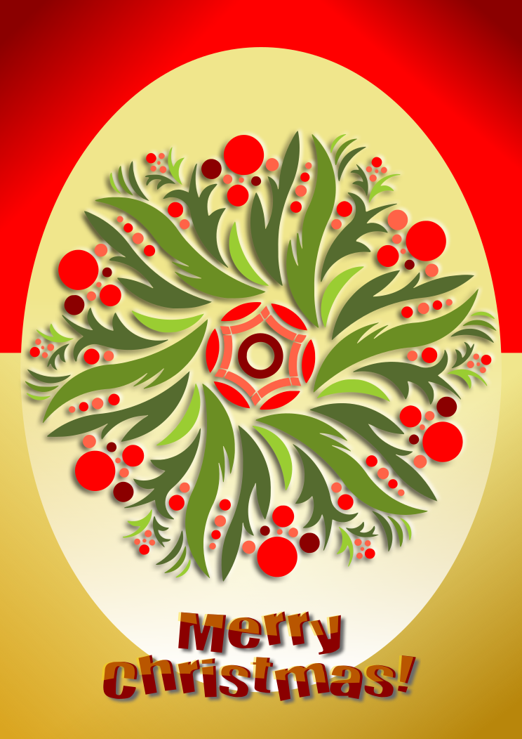 This features a beautifully designed Christmas card with a red and yellow background. In the center of the card, there is an ornate design that includes a large green circle with a red dot in it. This circle is surrounded by several smaller circles, creating a visually appealing pattern. Additionally, there are numerous small red berries scattered throughout the image, adding to its festive atmosphere. The overall effect is a warm and inviting holiday greeting card that captures the spirit of Christmas.