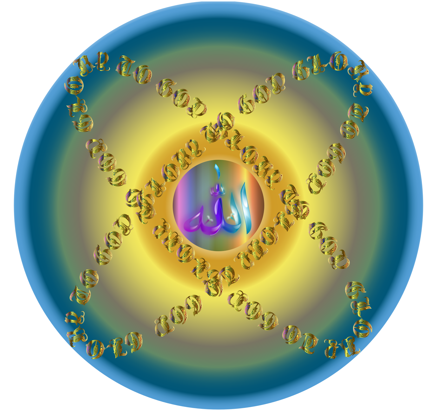This features a large, colorful circle with an Arabic word written in the center. This word is surrounded by several other words, creating a visually striking and intricate design. The circle itself has a blue background, which adds to its vibrant appearance. The combination of colors and textures makes this artwork stand out as a unique and eye-catching piece.