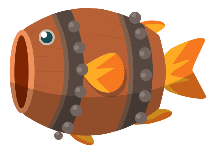 This features a cartoon fish with an open mouth, floating in the air. It is depicted as a wooden barrel or canister, giving it a unique and playful appearance. The fish's body is adorned with several yellow fins, adding to its whimsical design. The overall scene exudes a sense of fun and creativity, making it an appealing visual for children or those who enjoy lighthearted illustrations.