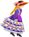 This features a woman dressed in a flowery dress, with her hair in pigtails. She is wearing a purple dress and has a hat on her head. The woman appears to be walking or dancing, as she is depicted in motion. The dress is adorned with flowers, adding a touch of elegance to the scene. The overall atmosphere suggests a lively and cheerful event where the woman is participating.