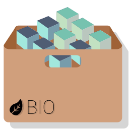 This features a brown box with the word "BIO" written on it. Inside the box, there are several small cubes of different colors, including blue and green. These cubes are stacked neatly inside the box, creating an organized appearance. The combination of the brown box and the colorful cubes gives off a sense of creativity and playfulness.