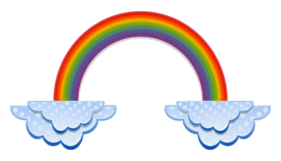 This features a colorful rainbow with two clouds on either side of it. Each cloud is shaped like an angel, adding a whimsical touch to the scene. The rainbow itself spans across most of the image, creating a vibrant and lively atmosphere. The clouds are positioned at the top left corner and bottom right corner of the picture, with one slightly overlapping the other. This unique combination of elements creates an eye-catching and cheerful visual display.