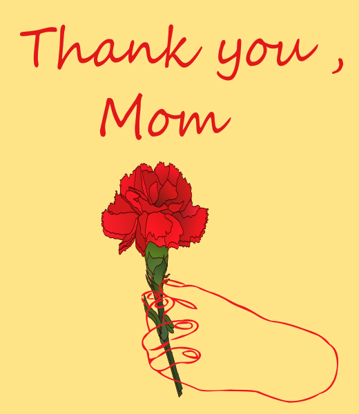This features a "Thank you Mom" card with the words "Thank you, Mom" written in red on it. Above these words is an illustration of a hand holding a red carnation, which adds a personal touch to the card. The design includes a lineart of the right hand and the flower, creating a visually appealing composition. The card's creator used the OCAL clipart "Carnation" by "Nunopequito," which is available for free use on various platforms. They also utilized the font "Segoe Script" to create a calligraphic effect, adding an elegant touch to the overall design. The combination of these elements results in a beautiful and thoughtful card that expresses gratitude towards one's mother.