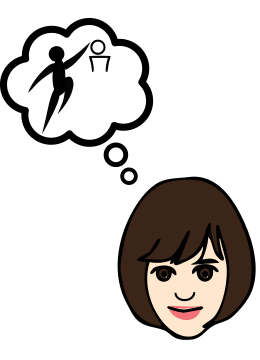 This features a woman with short hair, wearing glasses and smiling. She appears to be thinking about playing basketball as she is positioned in front of a thought bubble that contains an illustration of a person throwing a basketball. The scene is set against a backdrop of a brown wall.