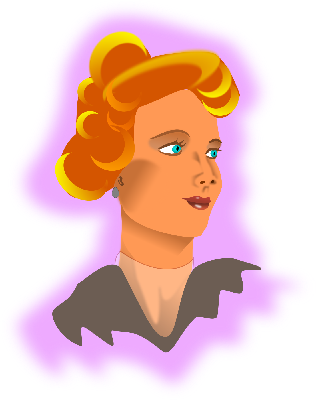 This features a woman with red hair and an orange complexion, wearing a brown shirt. She has a smiling expression on her face as she looks directly at the camera. Her eyes are bright blue, adding to her captivating appearance. The woman appears to be in a purple background, which adds a touch of color to the overall image.