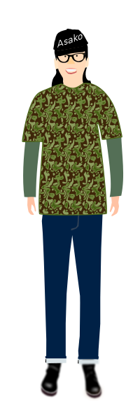 This features a cartoon character named Asako, who is wearing a camouflage patterned shirt. She appears to be standing in front of a wall with her arms crossed. Her outfit consists of blue jeans and black shoes, giving her a casual yet stylish appearance. The overall scene gives off a sense of confidence and individuality as Asako stands tall against the backdrop.