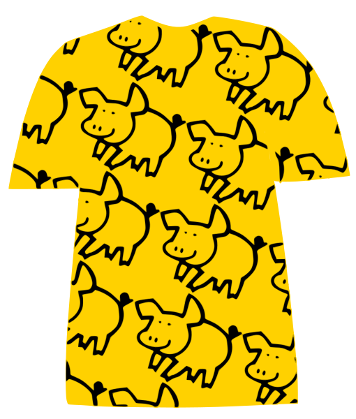 This features a yellow shirt with a pattern of pigs on it. There are several different positions and orientations of the pig images, creating an interesting visual effect. Some of the pigs are larger than others, while some are smaller or positioned closer to the edges of the shirt. Overall, the design is eye-catching and unique, making it a great choice for someone looking for a fun and quirky piece of clothing.