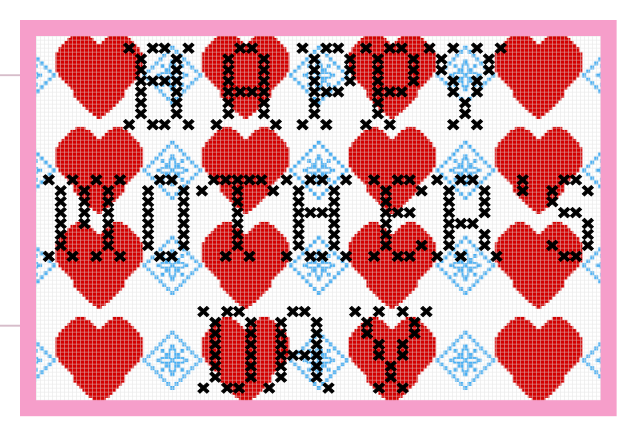 This features a handmade needlepoint style sign that reads "Happy Mother's Day." The sign is made up of various red hearts, which are scattered throughout the design. These hearts come in different sizes and shapes, adding visual interest to the overall appearance of the sign. The combination of the heart-shaped elements and the words "Mother's Day" creates a warm and inviting atmosphere for those celebrating their mothers on this special day.