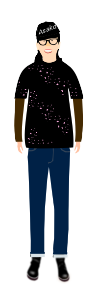 This features a cartoon character named "Asako" wearing a black shirt with a design of cherry blossoms falling. The character is standing in front of a plain background, showcasing their outfit and appearance. The character's clothing includes blue jeans that are visible on the lower half of the body, giving a sense of style and personality to the cartoon figure.