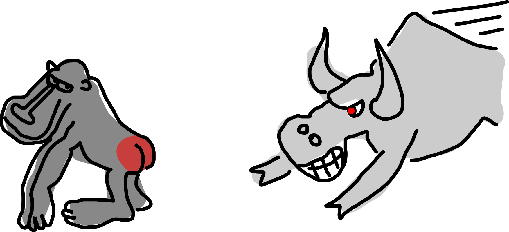 This features a cartoon drawing of two animals, one being a dragon and the other a monkey. They are both standing on a white background with no visible text or additional elements. The dragon appears to be in an aggressive stance, possibly attacking the monkey. The monkey is positioned towards the left side of the image, while the dragon occupies most of the right side. This comical scene showcases the contrast between these two characters and their unique appearances.