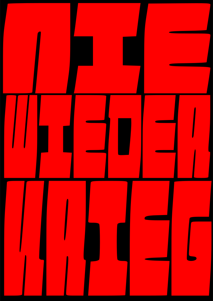 This is a red poster with black letters that reads "Nie wieder Krieg" in bold. The poster has a rectangular shape and the words are written in red, making them stand out against the black background. This phrase translates to "never again war," which suggests a message of peace or opposition to conflict. The poster's design is simple yet powerful, with the bold text drawing attention to its message.