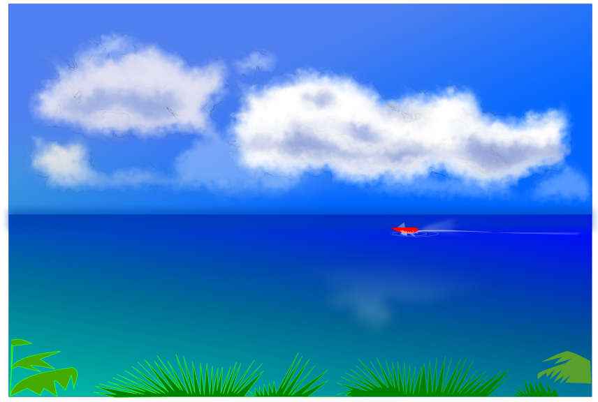 This features a beautiful blue ocean with white clouds in the sky. A red boat is sailing across the water, creating a sense of motion and excitement. The scene is set against a backdrop of palm trees, adding to the tropical atmosphere. The combination of the vibrant colors and the serene environment creates an inviting and picturesque view that captures the essence of a relaxing day by the sea.