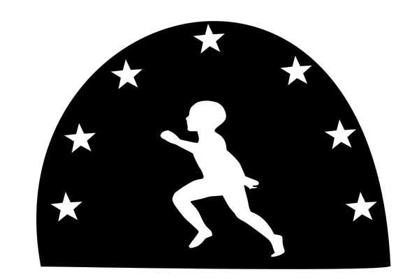 This features a silhouette of a child running, with the background filled with white stars. The child appears to be in motion, possibly participating in an athletic event or simply enjoying some outdoor playtime. The black and white color scheme adds a sense of depth and contrast to the scene, emphasizing the child's figure against the backdrop of the stars.
