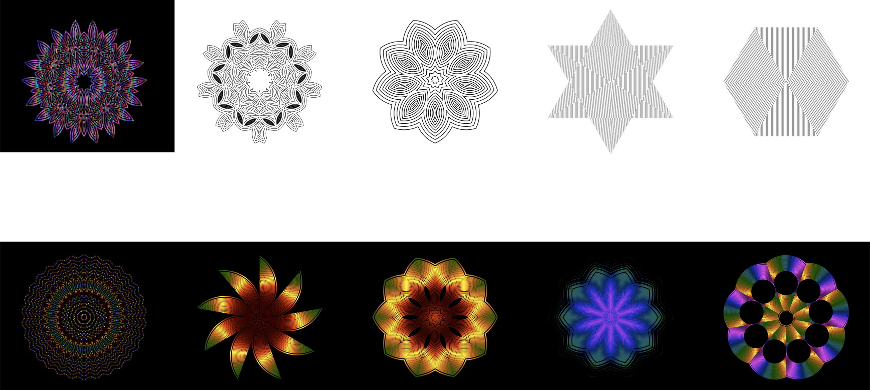This features a row of six geometric shapes, each with different colors and patterns. They are arranged in two rows, with the top row consisting of four black and white designs, while the bottom row showcases five colorful shapes. These intricate designs create an interesting visual display that can be appreciated by those who enjoy geometric patterns or artistic creations. The variety of colors and patterns within each shape adds a sense of depth and complexity to the overall composition of the image.