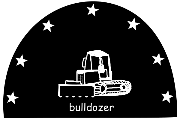 This is a black and white drawing of a bulldozer, which is a type of heavy equipment used for construction purposes. The bulldozer is depicted in the center of the image with its front facing forward. Above the bulldozer, there are seven stars arranged in a circular pattern, adding an artistic touch to the drawing. The word "bulldozer" is written below the image, indicating that it is indeed a representation of this type of equipment. This black and white sketch could be part of a daily doodle series or simply a creative expression by the artist.