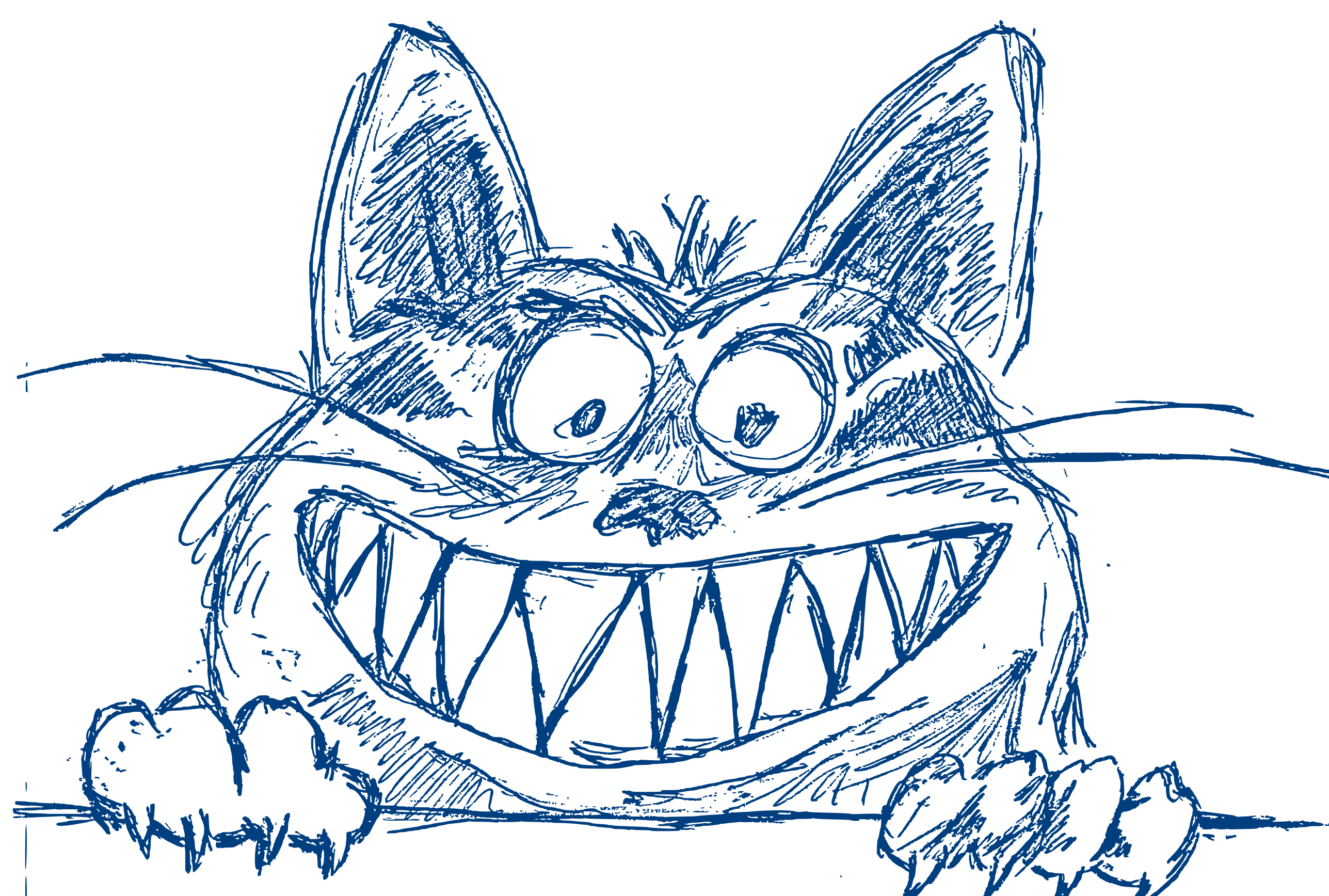 This features a cartoon drawing of a cat with an exaggerated, angry expression. It has large teeth and is making a funny face as it stares at the viewer. The cat's mouth is open wide, showing its teeth in a playful manner. The drawing appears to be done with a blue pen, giving it a unique and creative appearance. This whimsical illustration captures the essence of a mischievous feline character.