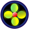 This features a circular icon with four yellow petals and a red center. Each of the petals is slightly overlapping, creating an intricate design. The icon has a dark blue border around it, which adds to its visual appeal. This unique design could be used for various purposes such as decoration or even as a symbol in a specific context.