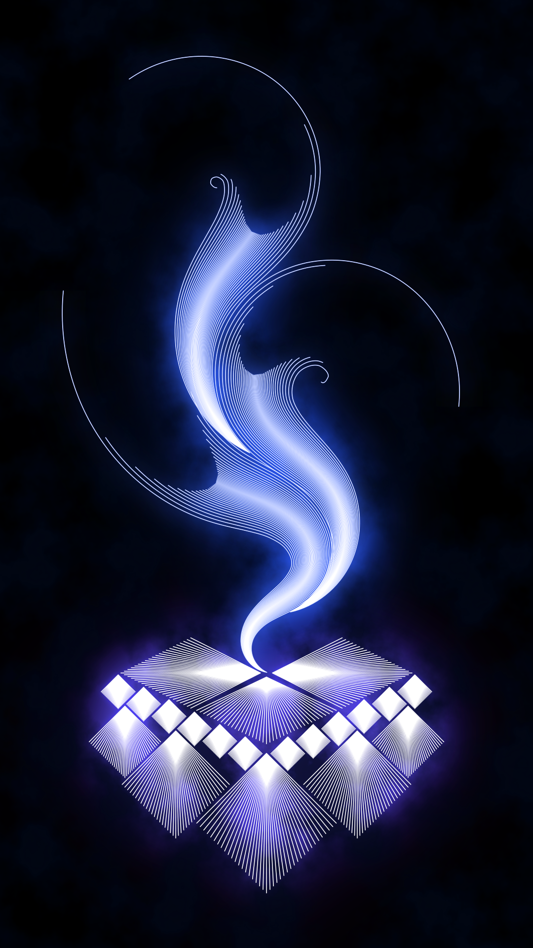 This features a blue and white design with an abstract, artistic flair. In the center of the scene, there is a blue spiral or swirl that appears to be rising upwards. This central element is surrounded by several smaller, geometric shapes in various shades of blue and white. These shapes are arranged around the main spiral, creating a visually appealing composition. The overall effect is an intriguing and captivating design that showcases the artist's skill and creativity.