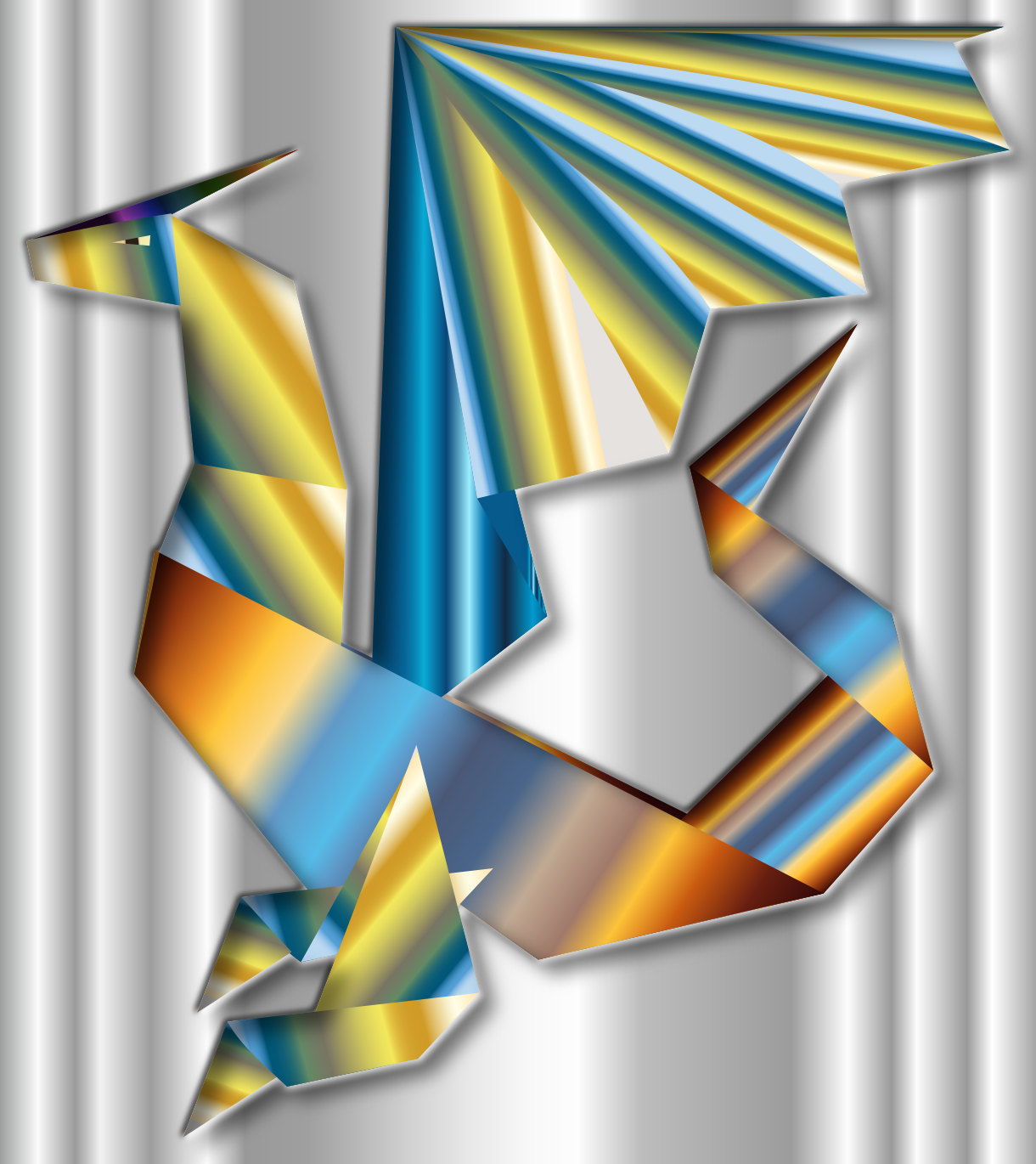 This features a colorful dragon made out of shiny paper. It is positioned in the center of the scene, with its wings spread wide and its body extending from left to right. The dragon's colors are vibrant and eye-catching, making it stand out against the grey background. This unique design gives the impression that the dragon is made out of paper or a similar material, adding an artistic touch to the overall composition.