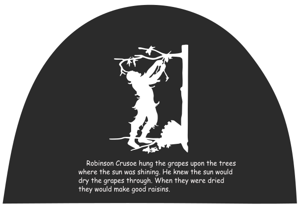 This features a silhouette of Robinson Crusoe, the famous character from Daniel Defoe's novel. He is depicted hanging from a pole with grapes on it, possibly drying them in the sun. The scene appears to be set in a forest, as there are trees visible in the background. The silhouette of Robinson Crusoe is surrounded by words that provide context and information about his adventures. This image is an excerpt from "Robinson Crusoe Silhouettes: The Complete Story of Robinson Crusoe in Silhouettes," which is in the public domain.